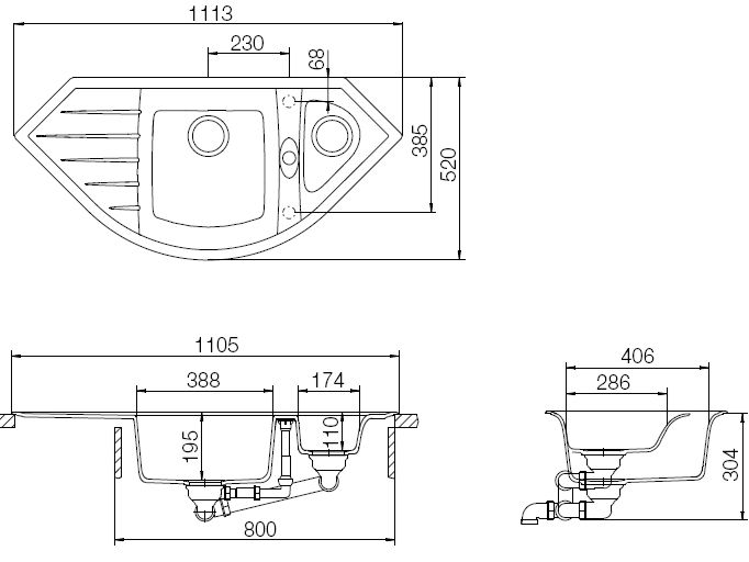 Отводная арматура c клапаном–автоматом 3 1/2'' и переливом для основной чаши, 3 1/2'' корзинчатый вентиль для дополнительной чаши, сифон с возможностью подключения посудомоечной или стиральной машины.
