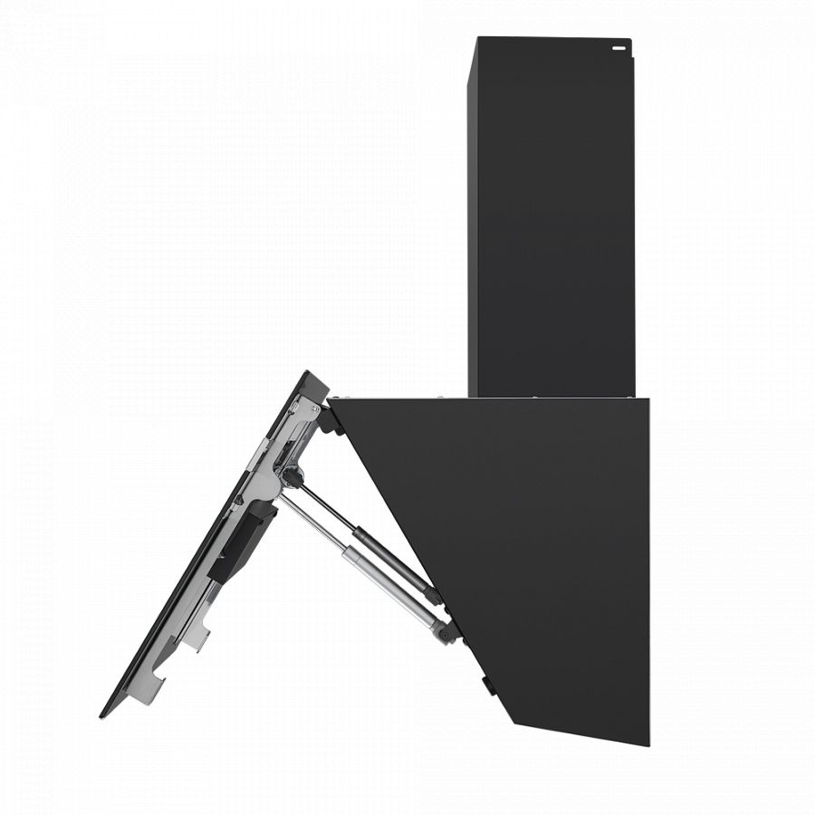 Наклонная вытяжка монтируется на стену над поверхностью плиты. На ваш выбор можно сделать отвод в вентиляционное отверстие или использовать сменный угольный фильтр.