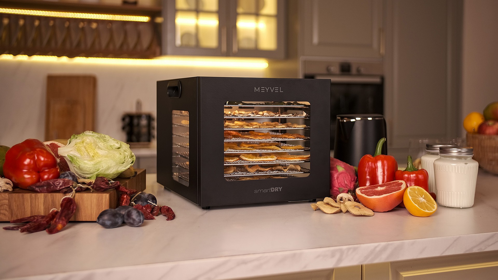 Meyvel MDH8-1S (Black) — это современный дегидратор, который создан для тех, кто хочет заготавливать фрукты, овощи, мясо, травы и ягоды без потери их вкуса и пользы круглый год. Прочный корпус, продуманная конструкция и умная электроника превращают его в надёжного помощника на каждый сезон.