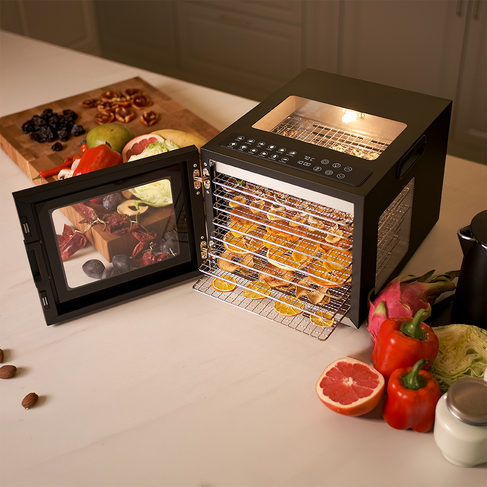 Чёрный корпус из нержавеющей стали, устойчивый к нагреву, влаге и коррозии, выглядит лаконично и современно, легко вписывается в интерьер кухни или мастерской. Внутри установлено 8 поддонов из нержавеющей стали с зазором 25 мм — этого достаточно, чтобы удобно размещать ломтики фруктов, травы или мясные полоски.