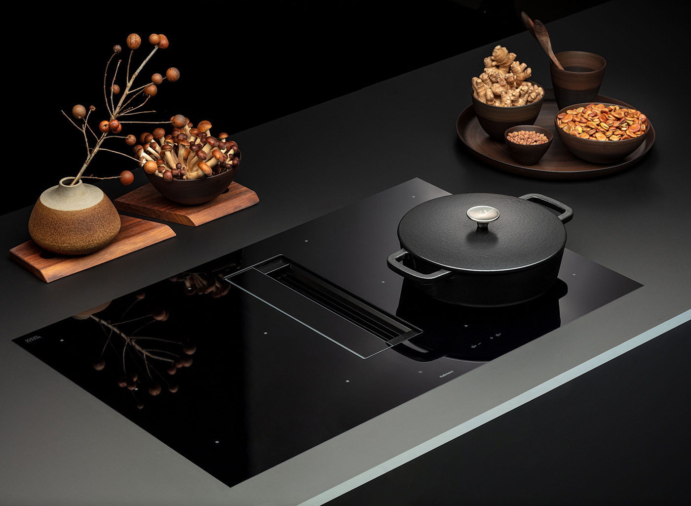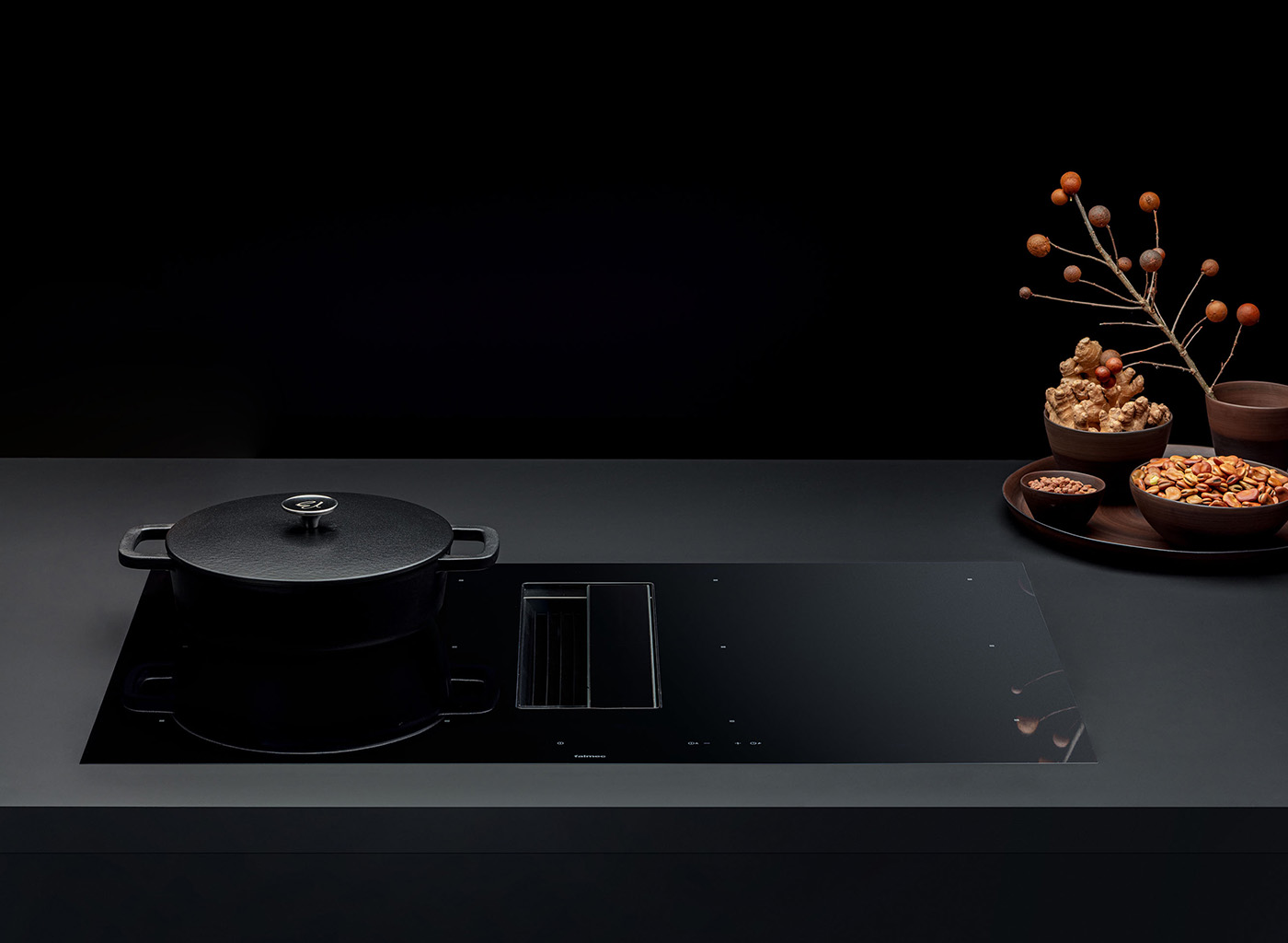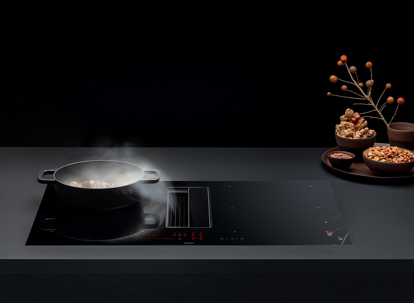 Особенности модели восстановление настроек варочной панели в случае случайного выключения, функция поддержания тепла: максимальная температура 70°, 9 уровней приготовления + функция Power (Over Boost), автоматический режим (скорость вытяжки автоматически регулируется в зависимости от мощности приготовления), емкость для сбора жидкости, возможность установки в один уровень со столешницей.