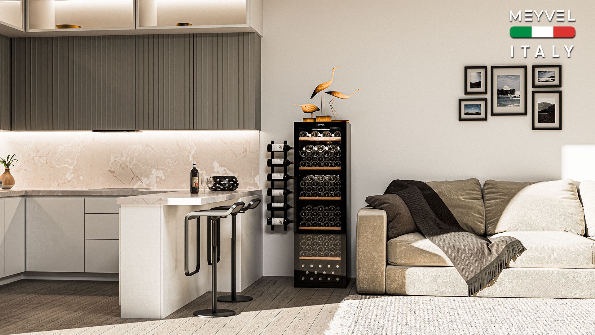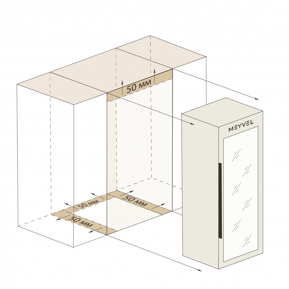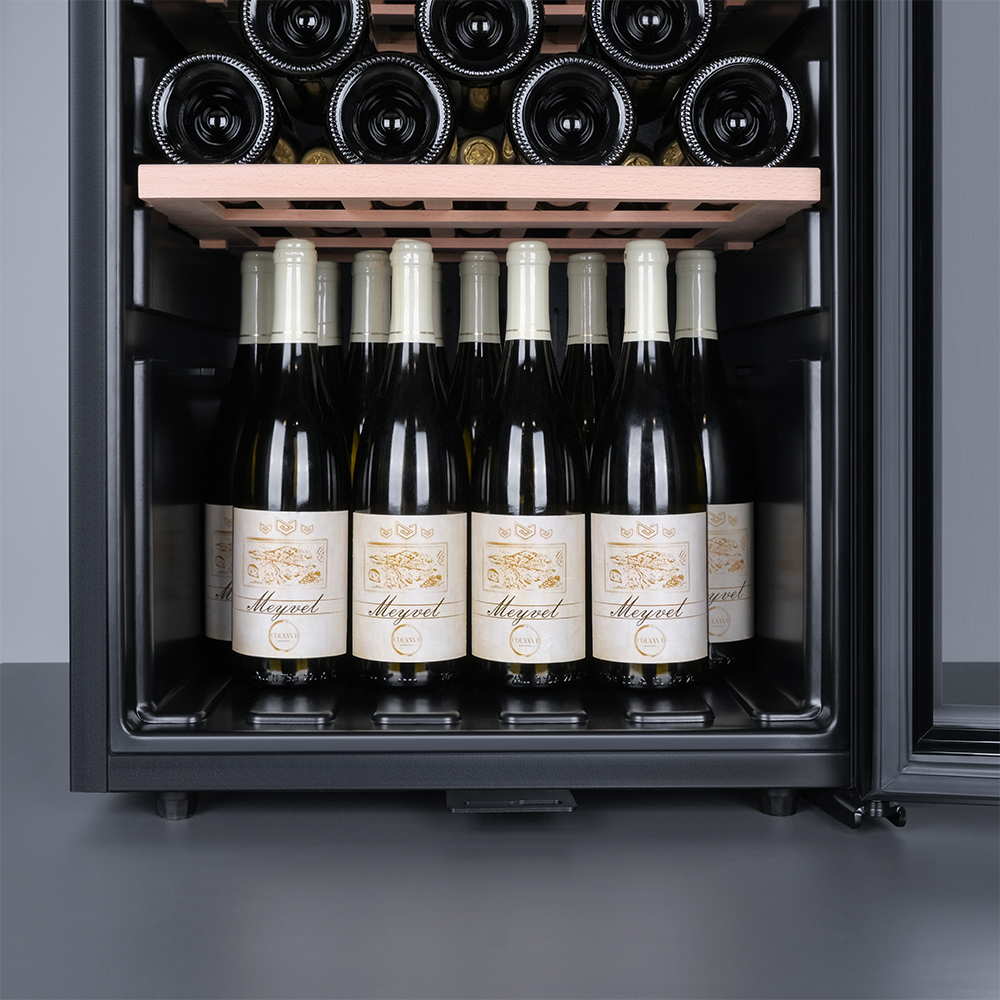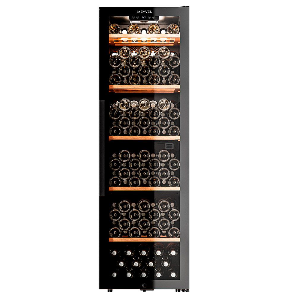 Meyvel MV133-KBF1 — отдельностоящее устройство, поэтому можно разместить его в любом удобном месте ресторана, отеля, бара или домашней винной комнаты без встраивания в мебель. Это удобно не только для создания стиля и атмосферы в интерьере, но и для предоставления легкого доступа к винам.