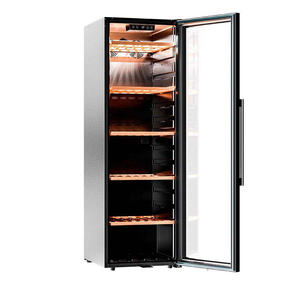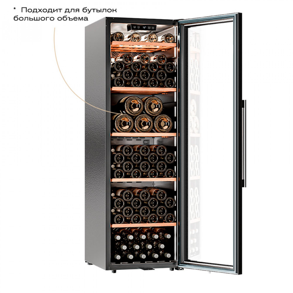 Модель оснащена пятью полками из дерева, что не только выглядит стильно, но и способствует правильной циркуляции воздуха внутри шкафа. Дополнительно можно установить до 8 полок, а также приобрести демонстрационную полку и полку для фужеров. Тройное стекло с УФ-фильтром надежно защищает вино от вредного воздействия света, что сохраняет его уникальный вкус и аромат.