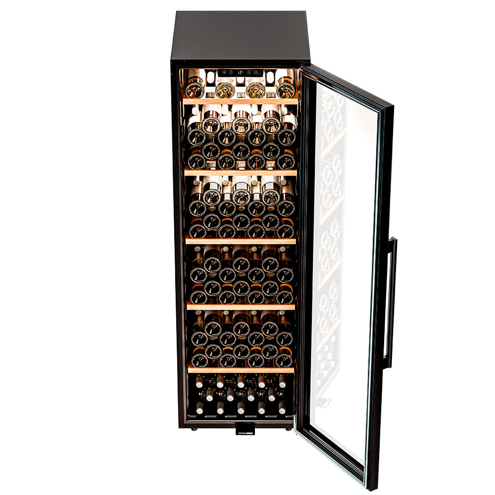 Управление осуществляется через сенсорную панель, а настройка интуитивно понятна. Также предусмотрены важные функции для защиты винотеки: замок на двери для безопасности, угольный фильтр, который очищает воздух внутри шкафа от посторонних запахов, сигнализация отклонения температуры, которая предупреждает о любых изменениях в условиях хранения, и блокировка панели управления, предотвращающая случайные изменения настроек.